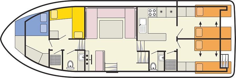 Double poste de pilotage intérieur et extérieur. 2 cabines avant, l'une avec un lit double, l'autre avec deux lits simples. Salon spacieux avec banquette/ poste de pilotage et porte coulissante donnant accés aux plats bords. Grande cuisine, sur niveau inférieur, équipée déun réfrigérateur. 2 cabines arriéres, avec chacune deux lits simples convertibles en grands lits doubles